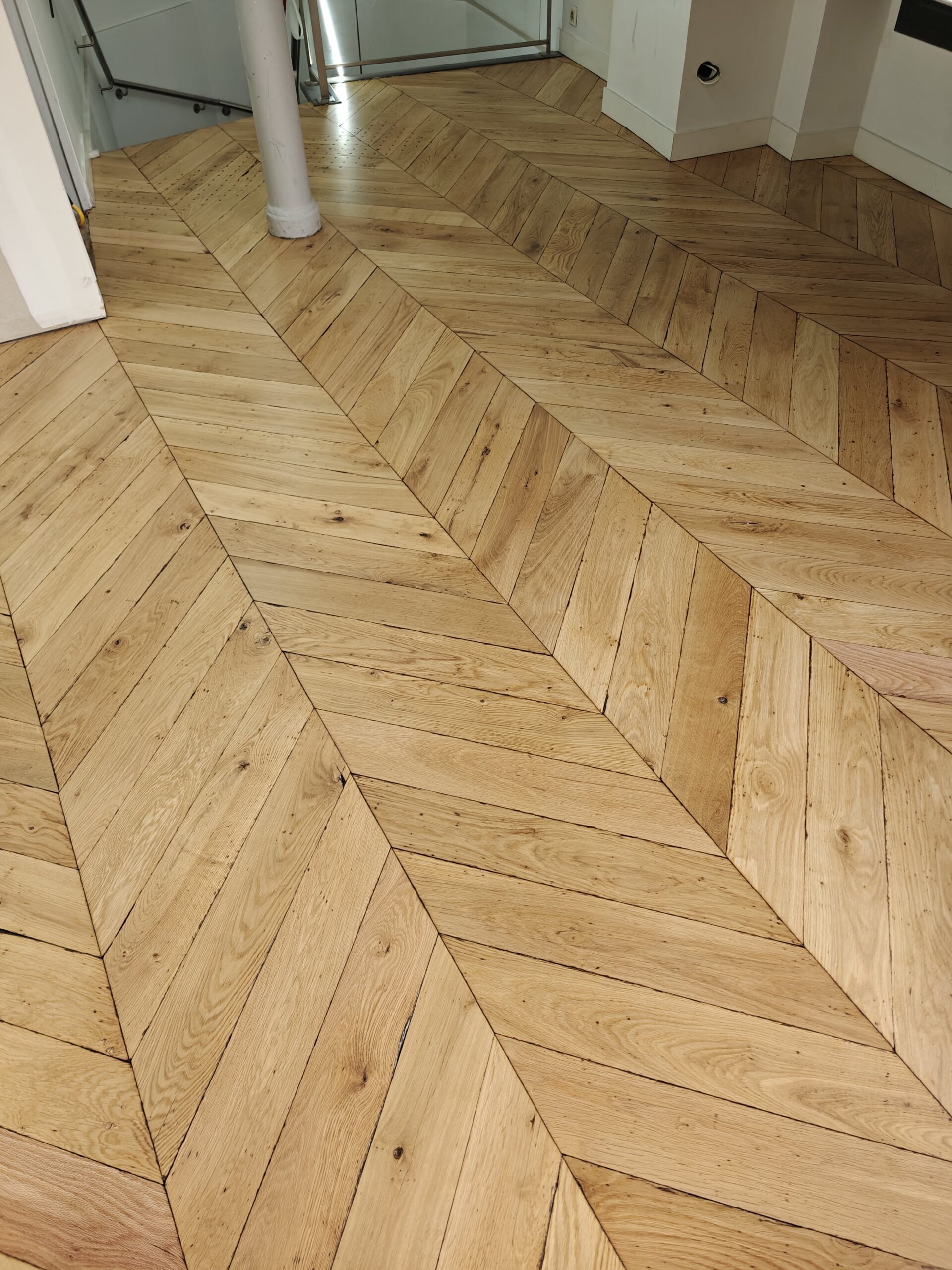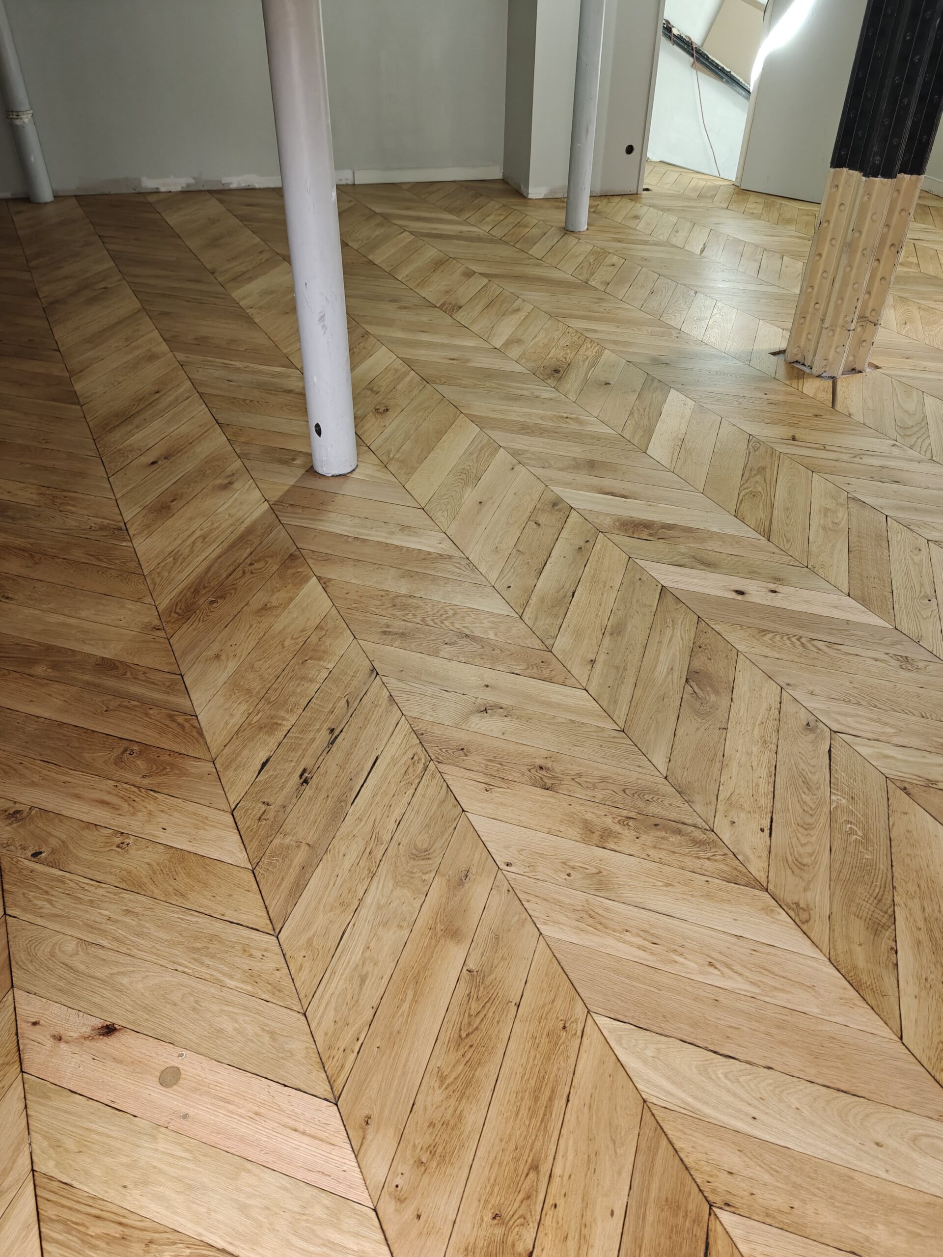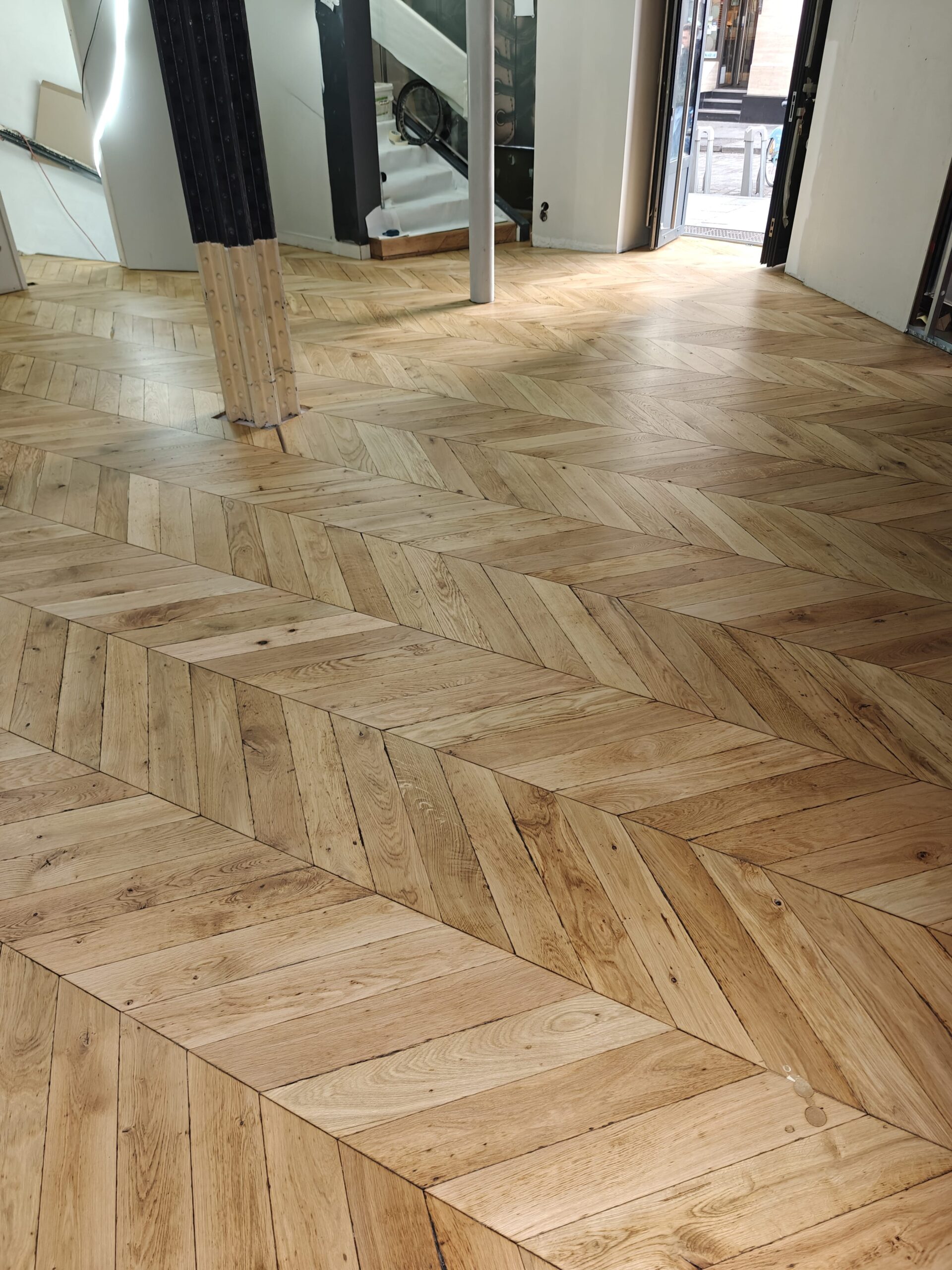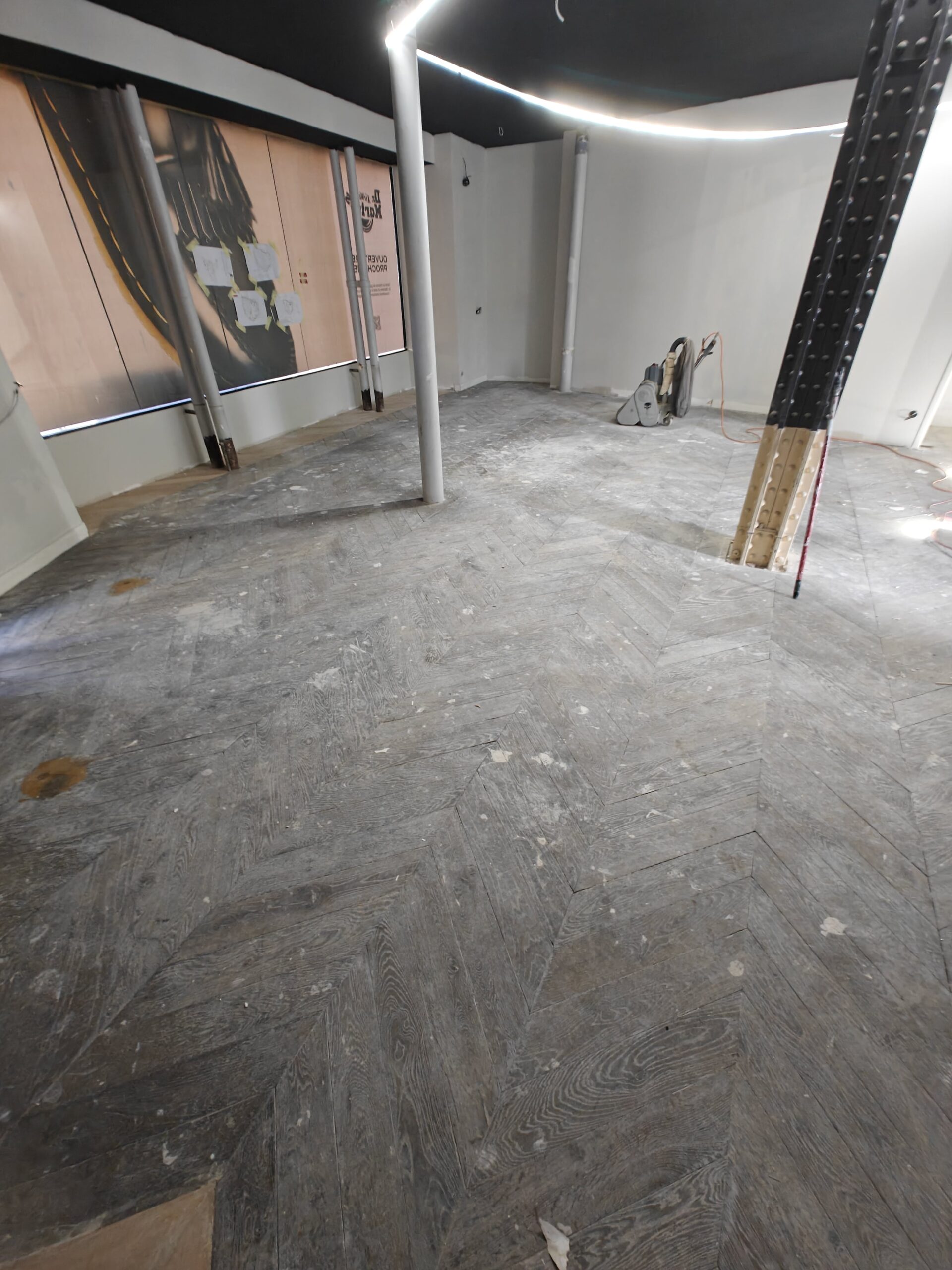 Nous avons réalisé la rénovation complète d’un parquet Point de Hongrie pour la boutique Dr. Martens, située dans le quartier animé de Saint-Michel à Paris. Après un ponçage minutieux et l’application d’une finition adaptée au passage intensif, le bois a retrouvé toute sa chaleur et son éclat d’origine. Ce travail a permis de sublimer l’espace de vente et de mettre en valeur l’authenticité du lieu, tout en garantissant une durabilité optimale face au flux quotidien de visiteurs.